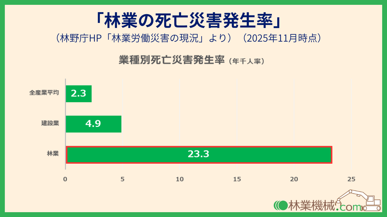 A. はい。林業の死亡災害発生率は年千人率23.3で、全産業平均(2.3)の約10倍、建設業(4.9)の約5倍です。(2024年度データ)