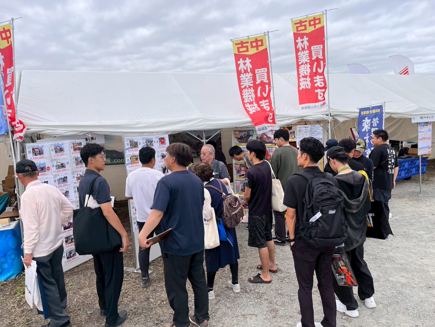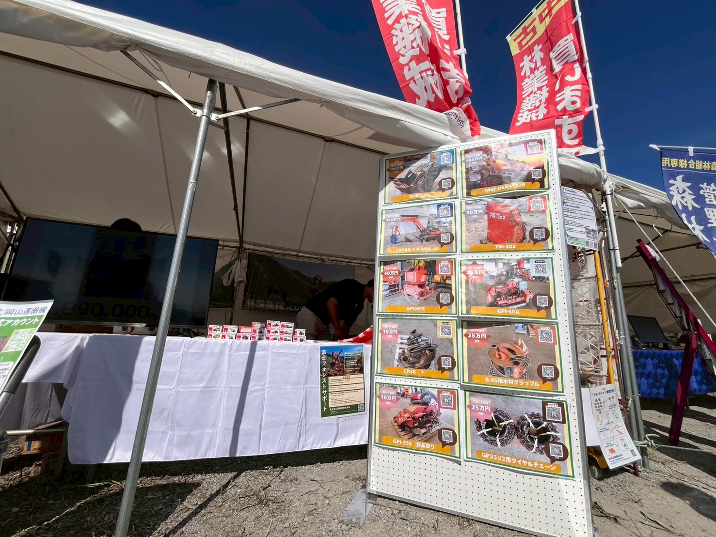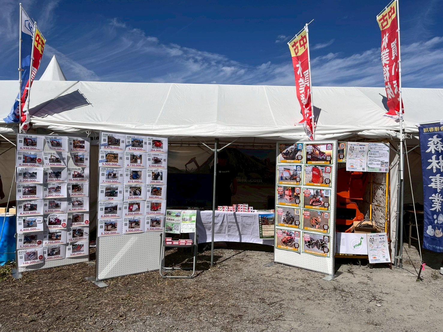 10月とは思えない暑いほどの日差しと海風の中、当社も例年通り「林業機械、売ります! 買います!」ののぼりをなびかせ、出展いたしました。