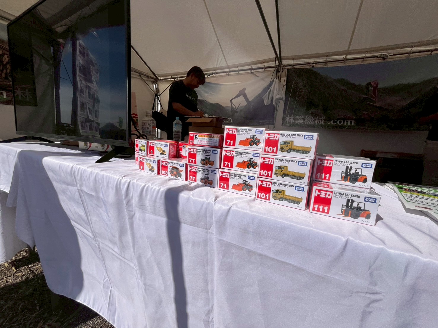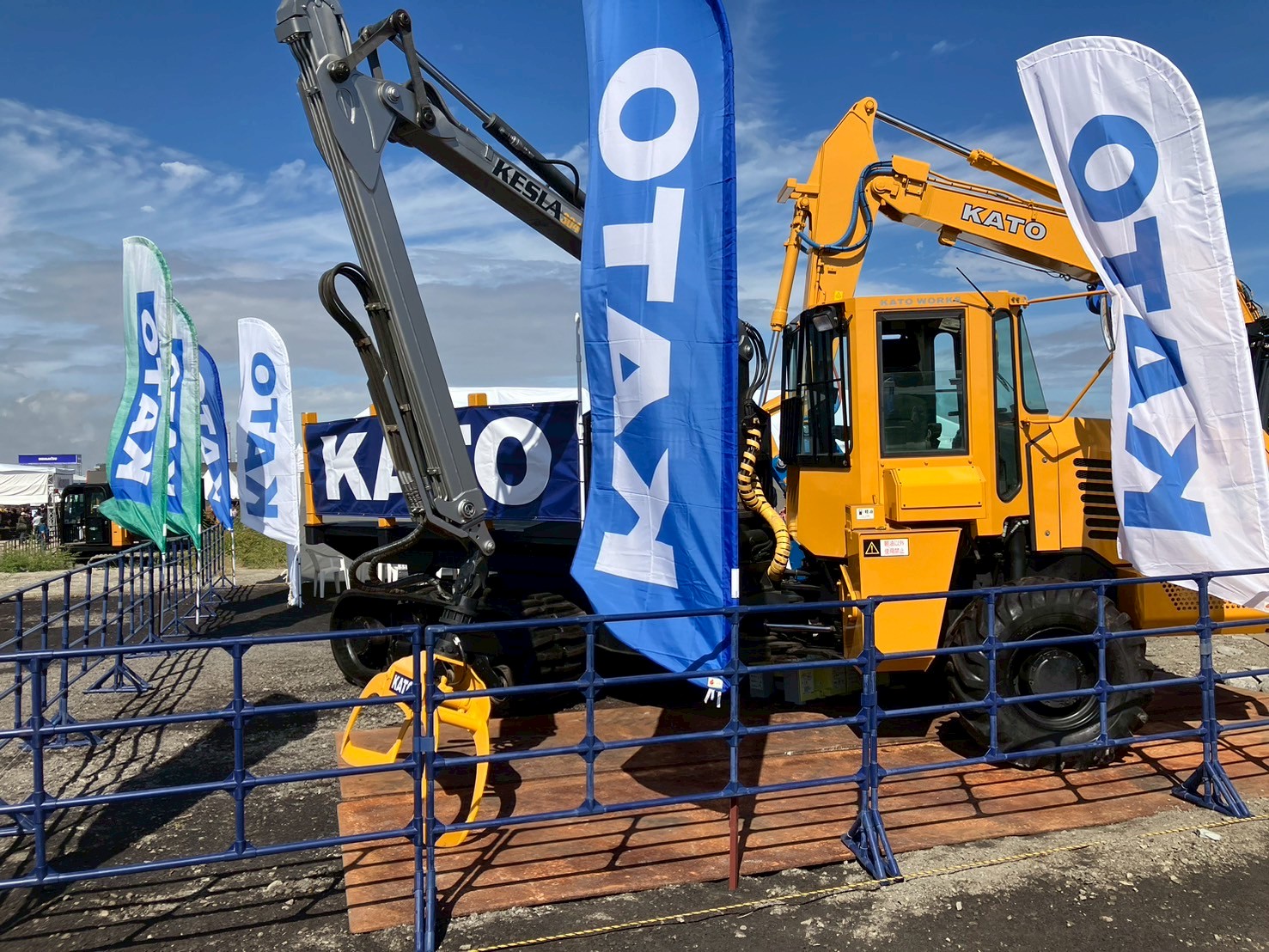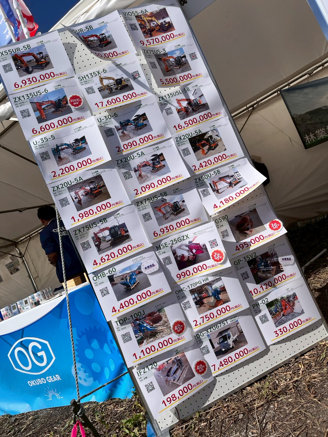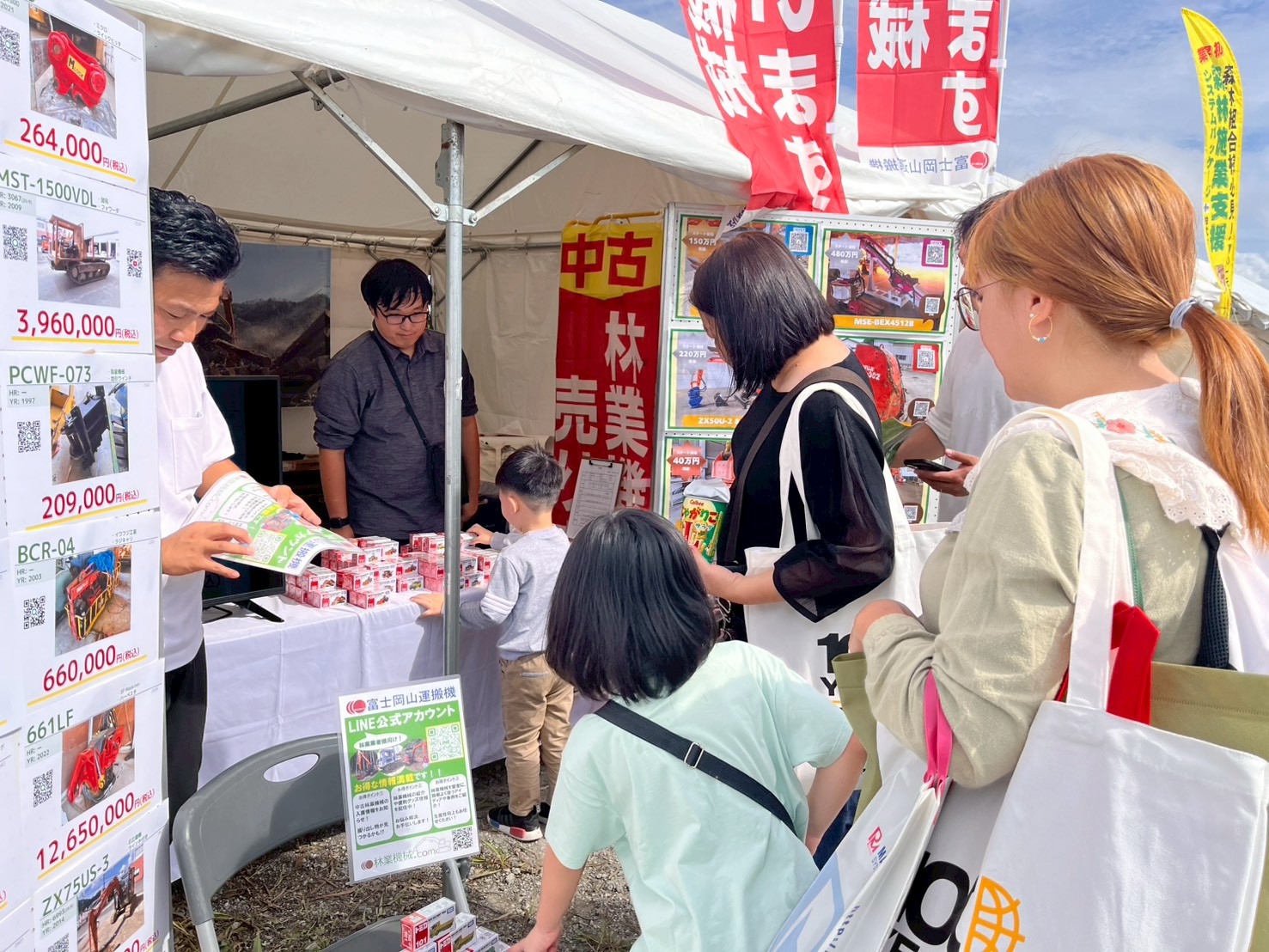 10月とは思えない暑いほどの日差しと海風の中、当社も例年通り「林業機械、売ります! 買います!」ののぼりをなびかせ、出展いたしました。